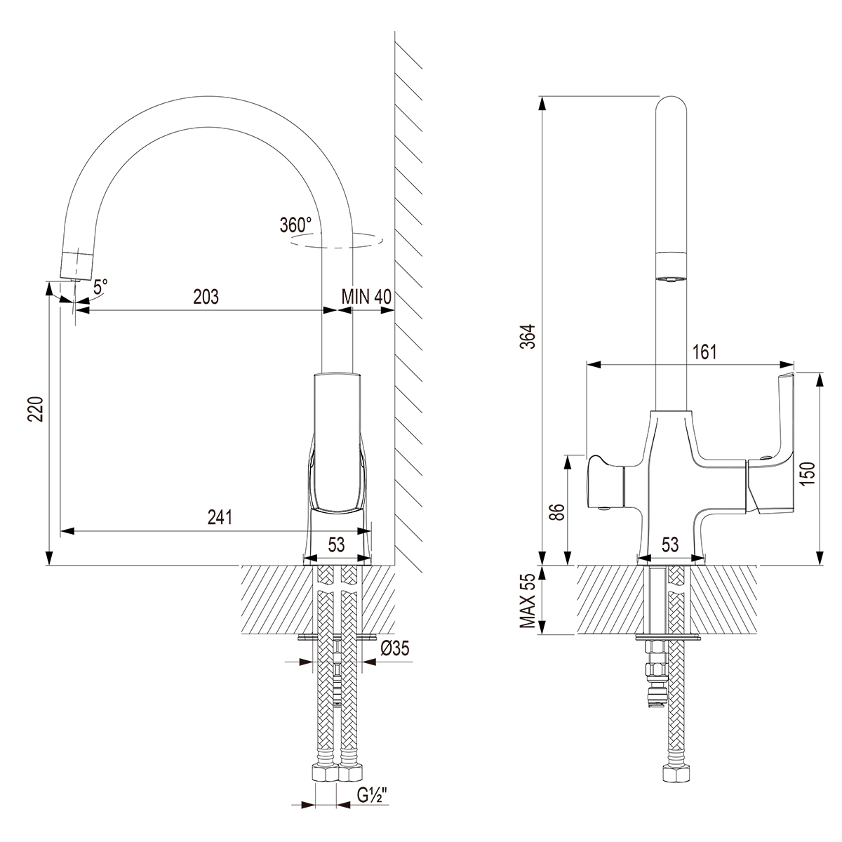 - Для крана с питьевой водой: кран-букса с керамическими пластинами (угол поворота - 90)