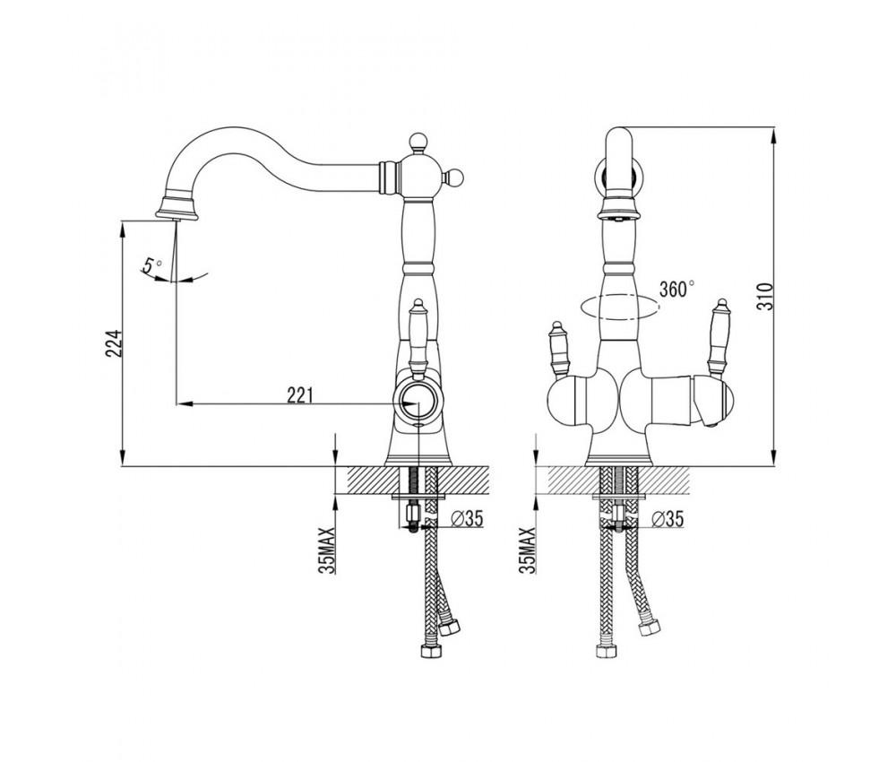 - Смеситель имеет керамический картридж 35 мм с функцией включения питьевой воды и переходник для подключения шланга от фильтра с питьевой водой