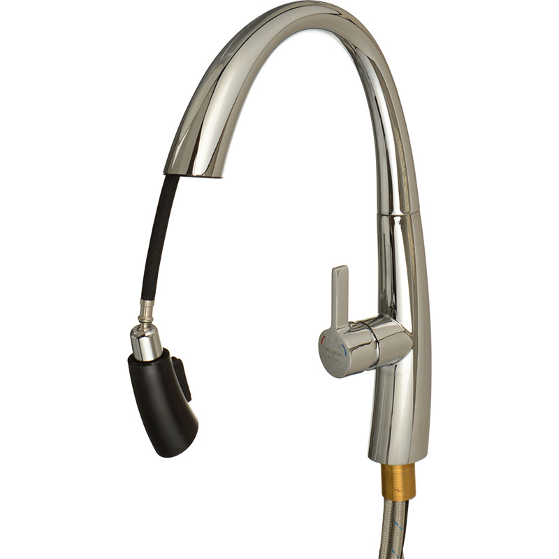 Корпус, ручки и излив из нержавеющей стали с хромированным покрытием, излив вытяжной с пластиковой крашенной в цвет смесителя лейкой кнопкой для регулировки типа струи, внутри нейлоновый шланг 1,5м серый с грузиком, картридж керамический Wanhai 35 мм, гибкая подводка из нержавеющей 50 см, без донного клапана, крепеж-гайка из нержавеющей стали с прокладками