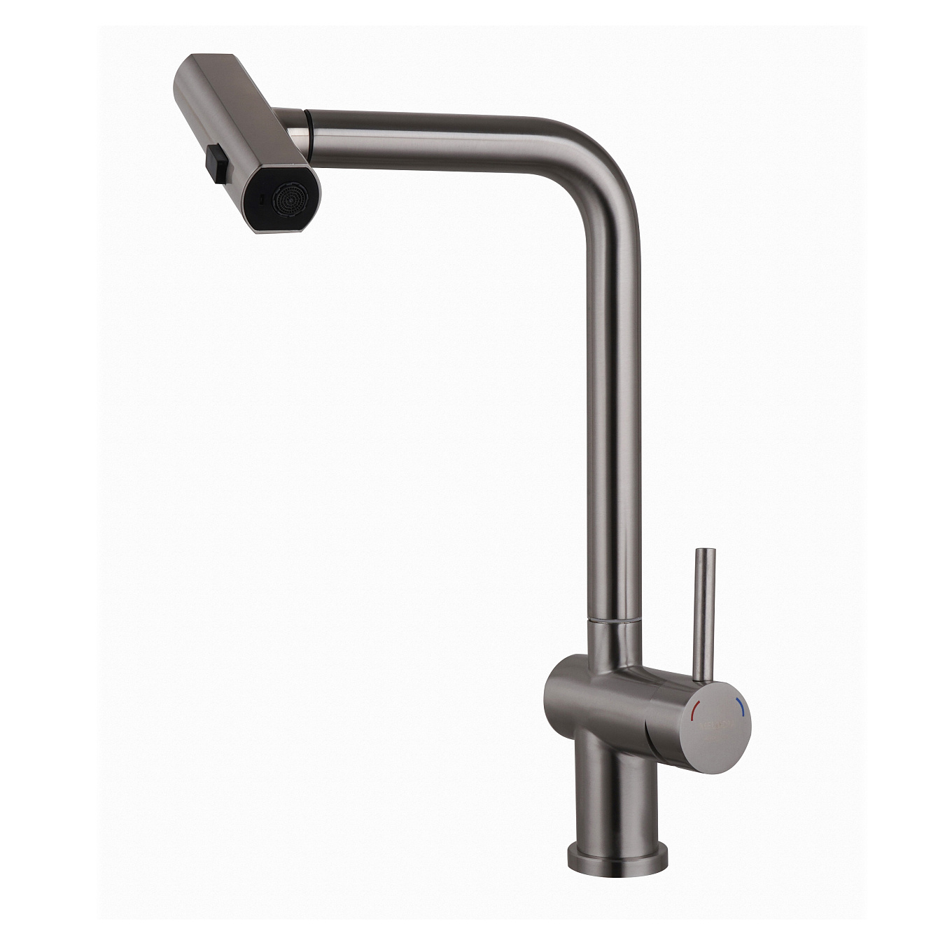 Корпус, ручки и излив из нержавеющей стали полированной, излив вытяжной с пластиковой крашенной в цвет смесителя лейкой 4в1: имеет 4 положения и 4 типа струй, внутри нейлоновый шланг 1,5м серый с грузиком, картридж керамический Wanhai 35 мм, гибкая подводка из нержавеющей 50 см, без донного клапана, крепеж-гайка нерж.сталь+ латунь