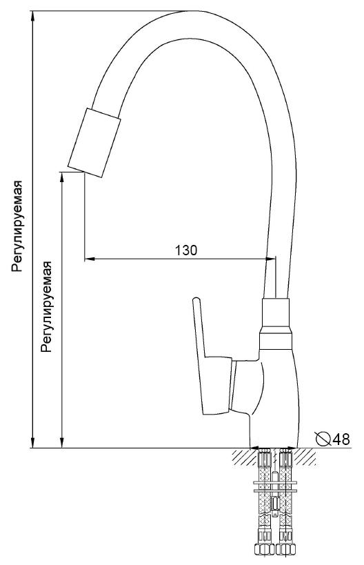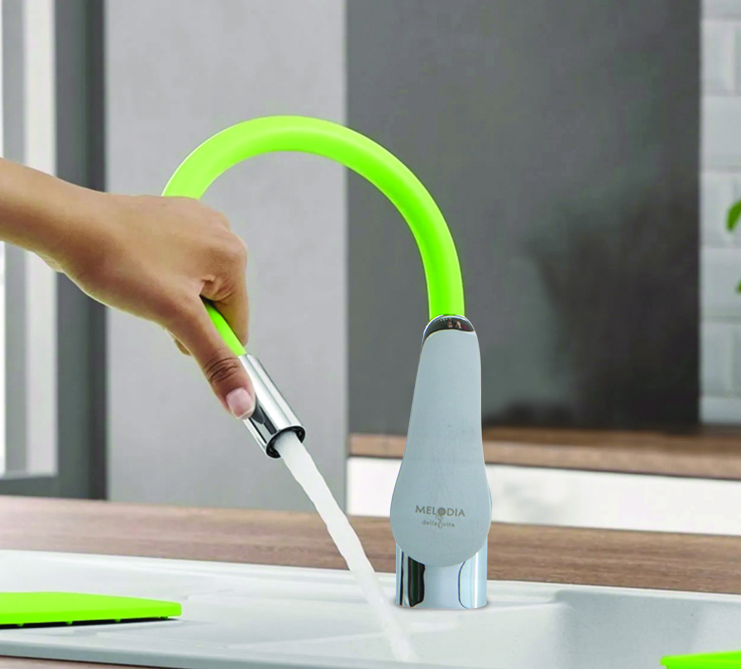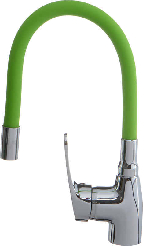 Смеситель для кухни MELODIA Ostessa с зелёным гибким изливом MDV 40615Green изготавливается в России. Надежный латунный корпус, гибкий силиконовый излив зелёного цвета, керамический картридж 40мм, без гибкой подводки в комплекте.