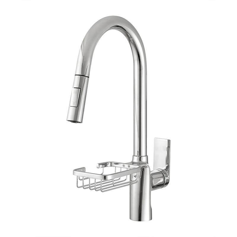 Корпус латунь, цинковая ручка с хромированным покрытием, картридж керамический Wanhai 35 мм, гайка картриджа из нержавеющей стали и латунная крышка картриджа, излив из нержавеющей стали вытяжной с лейкой ABS хром 2 типа струи, внутренний шланг из нейлона 1,5м серый, мыльница-корзина из нержавеющей стали в цвет корпуса, гибкая подводка из нержавеющей 50 см, без донного клапана, крепеж-гайка нерж.сталь+ латунь