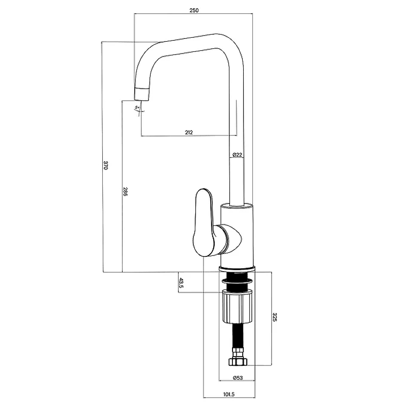 Смеситель для кухни, однозахватный, пластик, электрофоретическое покрытие, керамический картридж 35 мм, пластиковый аэратор, стальной излив, цинковая ручка. В комлекте: гибкая подводка 35 см, крепёж. Упаковка: коробка, микрогофрокартон, индивид. мешок