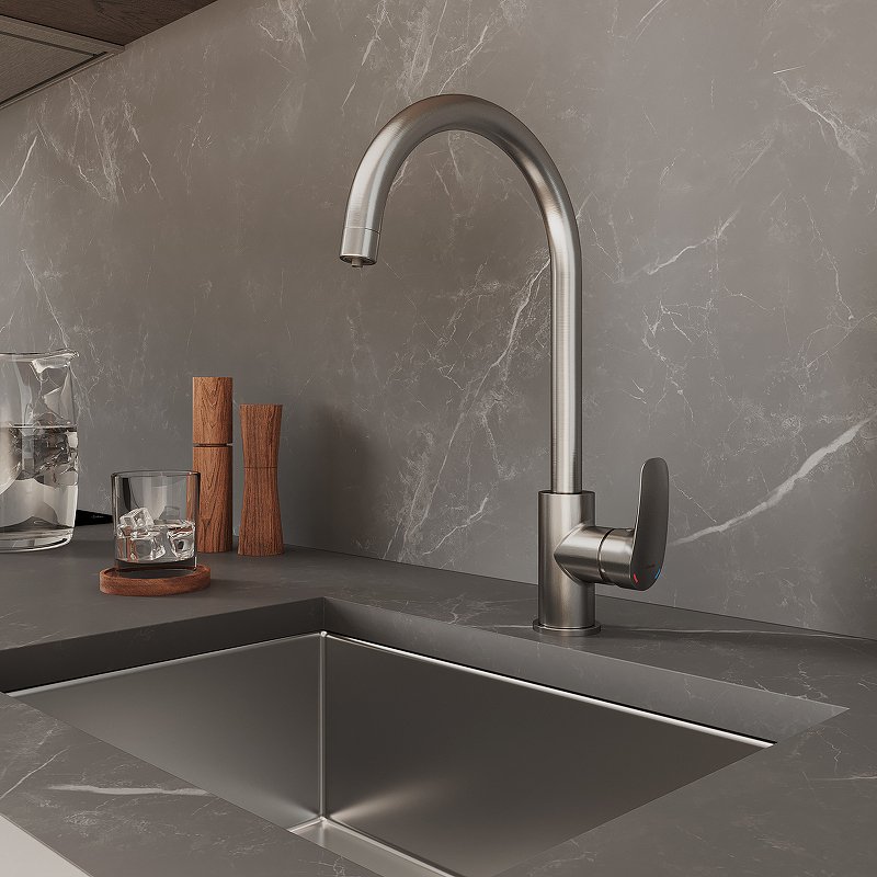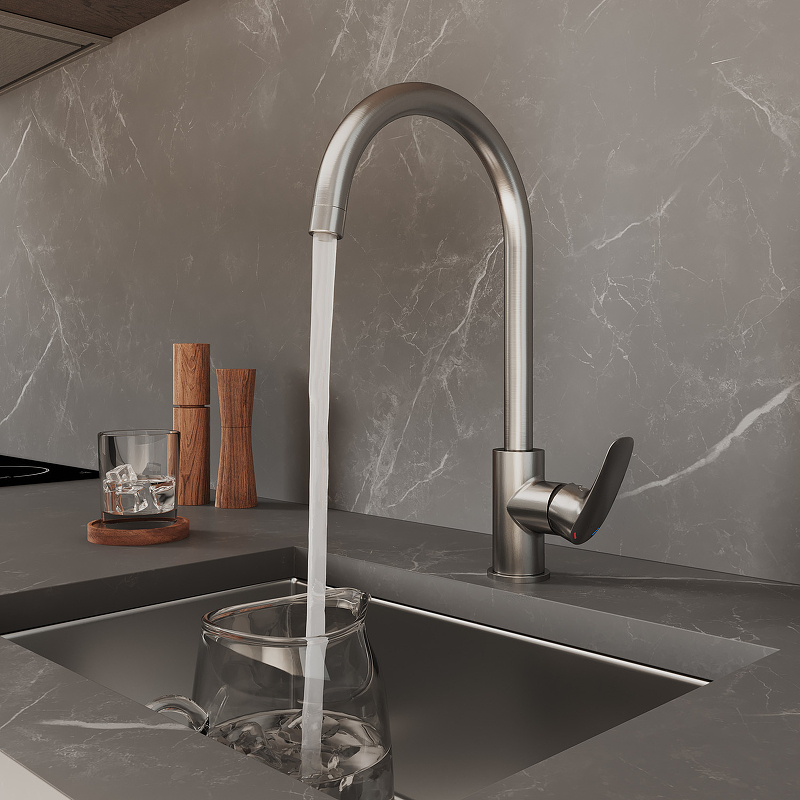 Смеситель для кухни с каналом для фильтрованной воды, однозахватный, латунь, сатин, керамический картридж 35 мм с функцией подачи фильтрованной воды, двухканальный пластиковый аэратор Neoperl с дополнительным каналом для питьевой воды. Смеситель управляется с использованием только одной ручки. Подача фильтрованной воды осуществляется при повороте ручки в закрытом состоянии. В комплекте: гибкая подводка, крепеж. Упаковка: картонная коробка, индивид мешок.