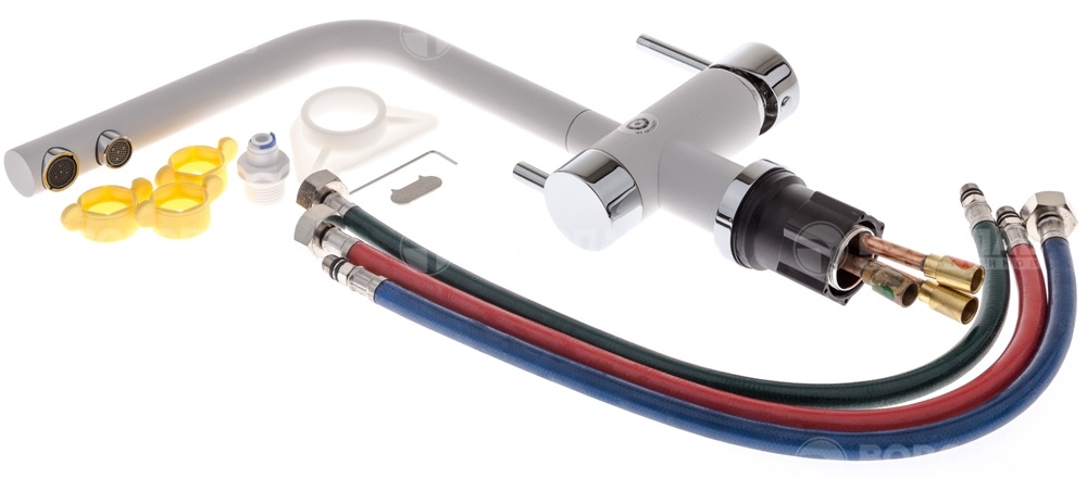 Cостав поставки: смеситель, гибкая подводка, аэратор, крепление