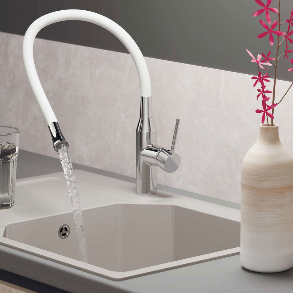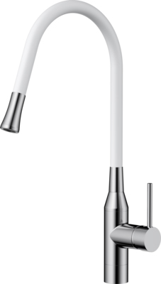 - Уникальная конструкция смесителя предусматривает возможность легкой замены цветных шлангов на один из трех вариаций: белый, красный и черный