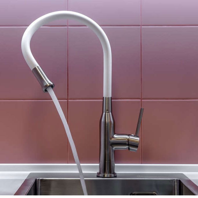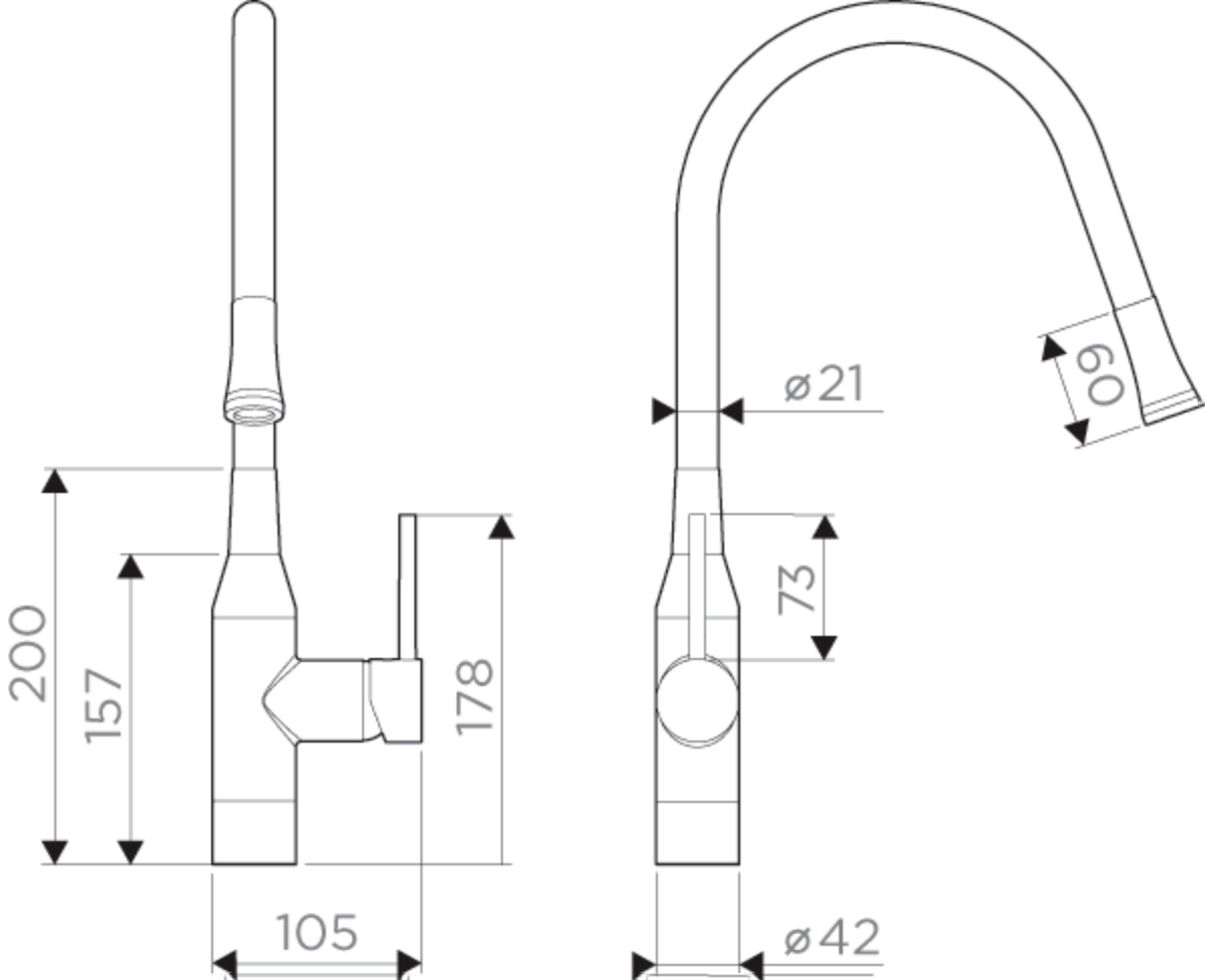 - Смеситель выполнен в ультрасовременном стиле и снабжен высоким поворотным шлангом, который при изменении формы всегда остается в устойчивом положении