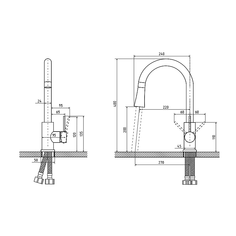 Состав поставки: смеситель, гибкая подводка, выдвижной излив
