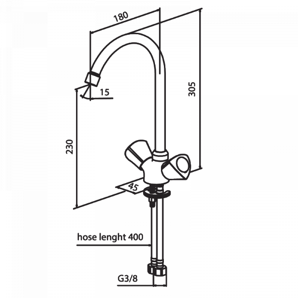 Материал: латунь. Конструкция излива: поворотный. Механизм: керамическая кран-букса. Тип подводки: гибкая. Аэратор: есть. Размеры: Длина излива: 180 мм. Высота смесителя: 305 мм