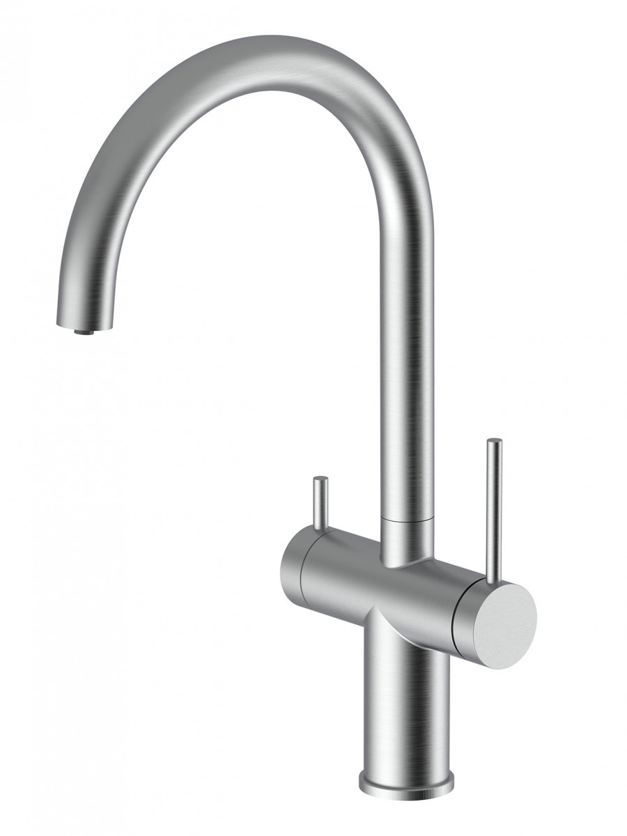 Смеситель Santek Энсо для кухни, подключение к фильтру, U-излив, нержавеющая сталь SUS304, цвет сатин Смеситель для кухни серии Энсо — стильный акцент акцент на вашей кухне и надежный помощник в бытовых делах. Его необычный дизайн и удобство использования станут отличным дополнением к современным интерьерам кухонь. Отличительной особенностью смесителя Энсо является его возможность подключения к бытовым фильтрам для питьевой воды. Он оснащен встроенным краном и отдельным каналом подачи фильтрованной воды. Включение и выключение питьевой воды осуществляется поворотом дополнительной ручки. Угол поворота основной ручки 90 градусов: от вертикального положения рычага до положения "на себя". Как правило, первое положение отвечает за холодную воду, второе - за горячую. Данная особенность позволяет комфортно пользоваться смесителем, особенно если он установлен близко к стене. Материал изготовления - нержавеющая сталь марки 304 идеальна для производства смесителей за счет наличия необходимых свойств: высокая прочность, антикоррозийная стойкость, устойчивость к резким перепадам температур и гигиеничность. Аккуратная внешняя сварка элементов смесителя, использование надежных комплектующих обеспечивает долгий срок службы изделия, удобство и безопасность в использовании. Благодаря тщательной и качественной полировке поверхности смесителя достигается благородный и приглушенный цвет стали. Подобная матовая стальная поверхность обладает антибактериальными свойствами и менее требовательна к уходу. Модель смесителя Энсо в цвете сатин никого не оставит равнодушным. Смеситель оснащен аэратором со сбалансированным расходом воды, насыщение струи воды воздухом делает поток ровным и мягким без брызг. Внутри смесителя установлен современный керамический картридж 35 мм, обеспечивающий плавный ход ручки смесителя, контроль и точность при выборе напора и температуры воды. Смеситель оснащен гибкими соединительными шлангами с увеличенной длиной 60 см. Внутренний шланг изготовлен по технологии сшитого полиэтилена (PEX) с увеличенным сроком службы до 50 лет, что делает гибкую подводку надежной и долговечной. Внешняя оплетка из нержавеющей стали марки 304 защищает от возможного разрыва и коррозии. Российский стандарт подключения шлангов с гайками G1/2" исключает возникновение проблем при установке смесителя. Благодаря системе крепления с двумя винтами смеситель можно легко и надежно установить на мойке даже в самых сложных условиях. Для монтажа смесителя потребуется только отвертка. Необходимый диаметр отверстия в мойке под смеситель - 33-35 мм.