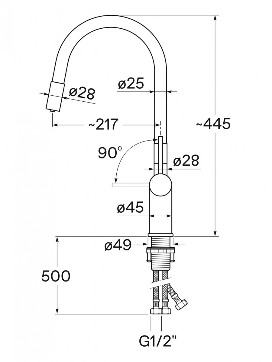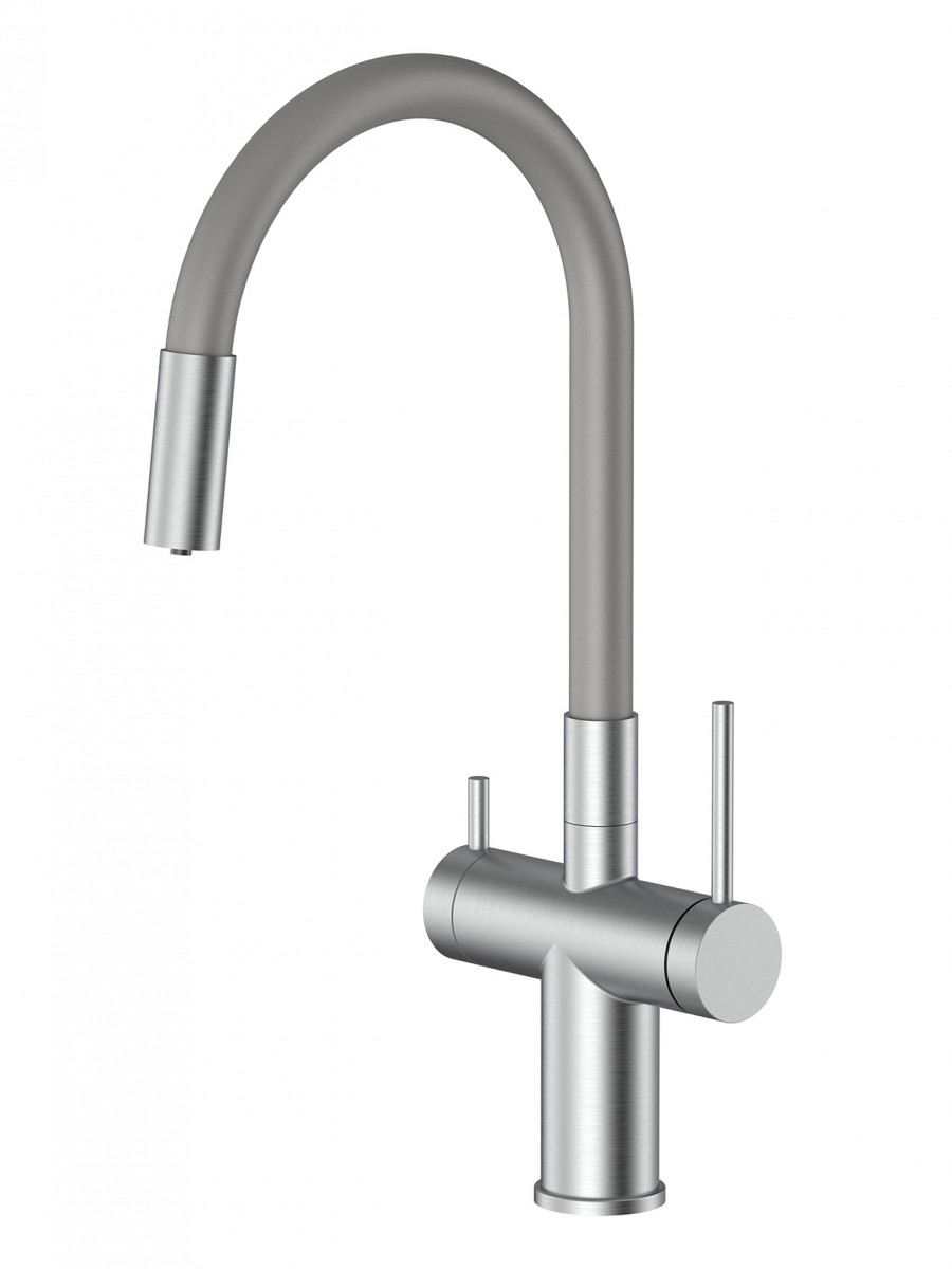 Смеситель Santek Энсо для кухни, подключение к фильтру, гибкий излив, нержавеющая сталь SUS304, цвет сатин Смеситель для кухни серии Энсо — стильный акцент на вашей кухне и надежный помощник в бытовых делах. Его необычный дизайн и удобство использования станут отличным дополнением к современным интерьерам кухонь. Гибкая конструкция излива фиксирует его в любом удобном положении над мойкой, добавляя функциональности на кухне. Отличительной особенностью смесителя Энсо является его возможность подключения к бытовым фильтрам для питьевой воды. Он оснащен встроенным краном и отдельным каналом подачи фильтрованной воды. Включение и выключение питьевой воды осуществляется поворотом дополнительной ручки. Угол поворота основной ручки 90 градусов: от вертикального положения рычага до положения "на себя". Как правило, первое положение отвечает за холодную воду, второе - за горячую. Данная особенность позволяет комфортно пользоваться смесителем, особенно если он установлен близко к стене. Материал изготовления - нержавеющая сталь марки 304 идеальна для производства смесителей за счет наличия необходимых свойств: высокая прочность, антикоррозийная стойкость, устойчивость к резким перепадам температур и гигиеничность. Аккуратная внешняя сварка элементов смесителя, использование надежных комплектующих обеспечивает долгий срок службы изделия, удобство и безопасность в использовании. Благодаря тщательной и качественной полировке поверхности смесителя достигается благородный и приглушенный цвет стали. Подобная матовая стальная поверхность обладает антибактериальными свойствами и менее требовательна к уходу. Модель смесителя Энсо в цвете сатин никого не оставит равнодушным. Смеситель оснащен аэратором со сбалансированным расходом воды, насыщение струи воды воздухом делает поток ровным и мягким без брызг. Внутри смесителя установлен современный керамический картридж 35 мм, обеспечивающий плавный ход ручки смесителя, контроль и точность при выборе напора и температуры воды. Смеситель оснащен гибкими соединительными шлангами с увеличенной длиной 60 см. Внутренний шланг изготовлен по технологии сшитого полиэтилена (PEX) с увеличенным сроком службы до 50 лет, что делает гибкую подводку надежной и долговечной. Внешняя оплетка из нержавеющей стали марки 304 защищает от возможного разрыва и коррозии. Российский стандарт подключения шлангов с гайками G1/2" исключает возникновение проблем при установке смесителя. Благодаря системе крепления с двумя винтами смеситель можно легко и надежно установить на мойке даже в самых сложных условиях. Для монтажа смесителя потребуется только отвертка. Необходимый диаметр отверстия в мойке под смеситель - 33-35 мм.
