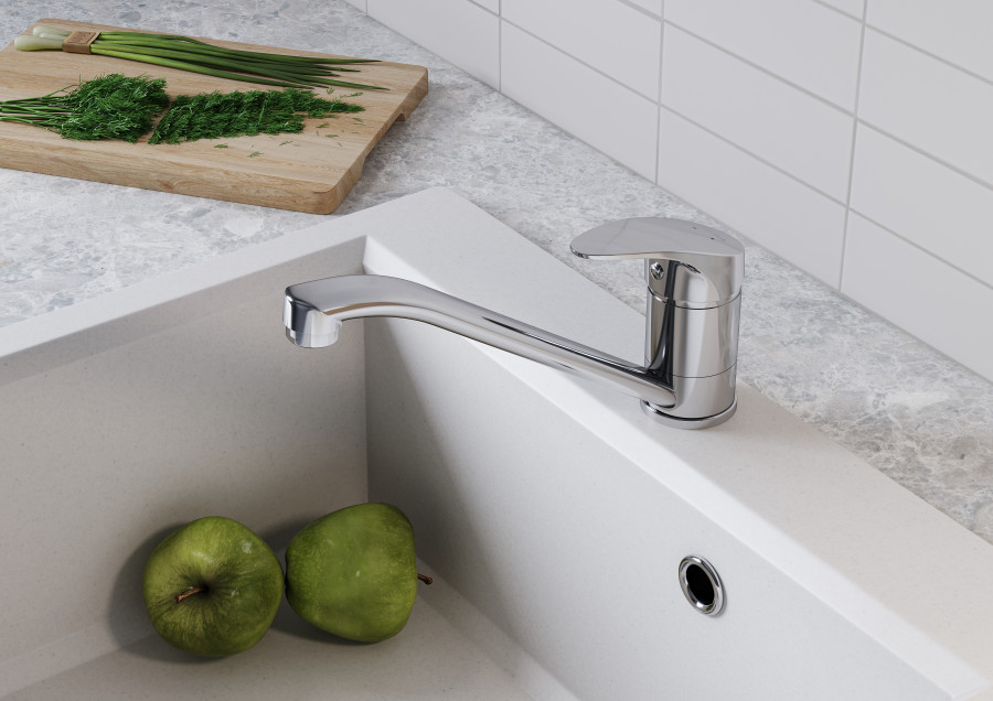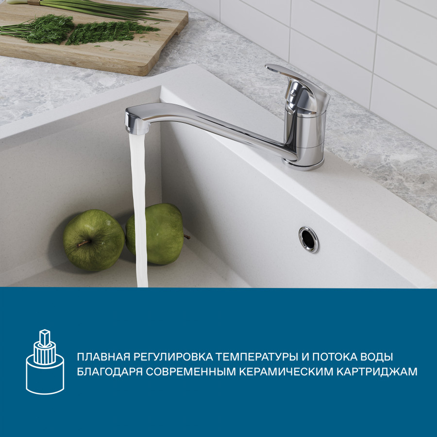 Santek Мавис Смеситель однорычажный для кухни, хром, - установка на одно отверстие, - поворотный излив, - ровный и мягкий поток без брызг за счет насыщения струи воды воздухом, - Гибкая подводка G1/2" x M10, - сверхпрочные шланги гибкой подводки, изготовленные по технологии сшитого полиэтилена (PEX) с увеличенным сроком службы до 50 лет, в оплетке из нержавеющей стали AISI 304, - керамический картридж D40 мм, плавный ход рычага смесителя, контроль и точность при выборе напора и температуры воды, - долгий срок службы, герметичность и безопасность для здоровья за счет использования высококачественных материалов и надежных компонентов, - хромированная поверхность, зеркальный блеск и защита от коррозии на долгий срок.