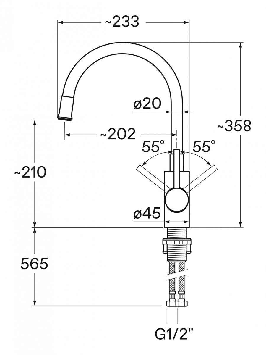 Смеситель Santek Риф для кухни, гибкий излив, нержавеющая сталь SUS304, цвет сатин Смеситель для кухни серии Риф — проверенная временем классика, сочетающая в себе удобную конструкцию и современный дизайн. Смеситель гармонично впишется в современный интерьер кухни, сделает рабочую зону комфортной и практичной. Гибкая конструкция излива фиксирует его в любом удобном положении над мойкой, добавляя функциональности на кухне. Материал изготовления - нержавеющая сталь марки 304 идеальна для производства смесителей за счет наличия необходимых свойств: высокая прочность, антикоррозийная стойкость, устойчивость к резким перепадам температур и гигиеничность. Аккуратная внешняя сварка элементов смесителя, использование надежных комплектующих обеспечивает долгий срок службы изделия, удобство и безопасность в использовании. Благодаря тщательной и качественной полировке поверхности смесителя достигается благородный и приглушенный цвет стали. Подобная матовая стальная поверхность обладает антибактериальными свойствами и менее требовательна к уходу. Модель смесителя Риф в цвете сатин никого не оставит равнодушным. Смеситель оснащен аэратором со сбалансированным расходом воды, насыщение струи воды воздухом делает поток ровным и мягким без брызг. Внутри смесителя установлен современный керамический картридж 35 мм, обеспечивающий плавный ход ручки смесителя, контроль и точность при выборе напора и температуры воды. Смеситель оснащен гибкими соединительными шлангами с увеличенной длиной 60 см. Внутренний шланг изготовлен по технологии сшитого полиэтилена (PEX) с увеличенным сроком службы до 50 лет, что делает гибкую подводку надежной и долговечной. Внешняя оплетка из нержавеющей стали марки 304 защищает от возможного разрыва и коррозии. Российский стандарт подключения шлангов с гайками G1/2" исключает возникновение проблем при установке смесителя. Благодаря системе крепления с двумя винтами смеситель можно легко и надежно установить на мойке даже в самых сложных условиях. Для монтажа смесителя потребуется только отвертка. Необходимый диаметр отверстия в мойке под смеситель - 33-35 мм.