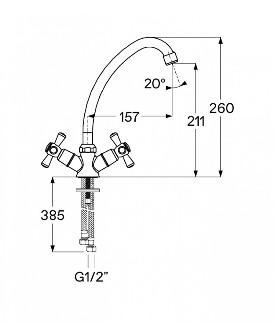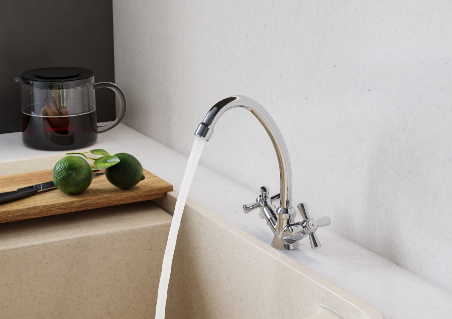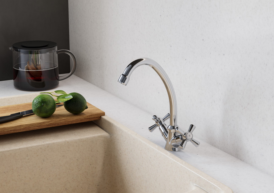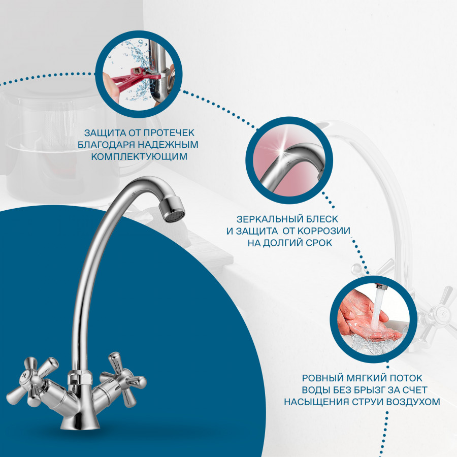 Santek Рокс Смеситель двухвентильный для кухни, хром, - установка на одно отверстие, - ровный и мягкий поток без брызг за счет насыщения струи воды воздухом, - Гибкая подводка G1/2" x M10, - сверхпрочные шланги гибкой подводки, изготовленные по технологии сшитого полиэтилена (PEX) с увеличенным сроком службы до 50 лет, в оплетке из нержавеющей стали AISI 304, - керамические кран-буксы, плавный поворот ручек смесителя, контроль и точность при выборе напора и температуры воды, - долгий срок службы, герметичность и безопасность для здоровья за счет использования высококачественных материалов и надежных компонентов, - хромированная поверхность, зеркальный блеск и защита от коррозии на долгий срок.