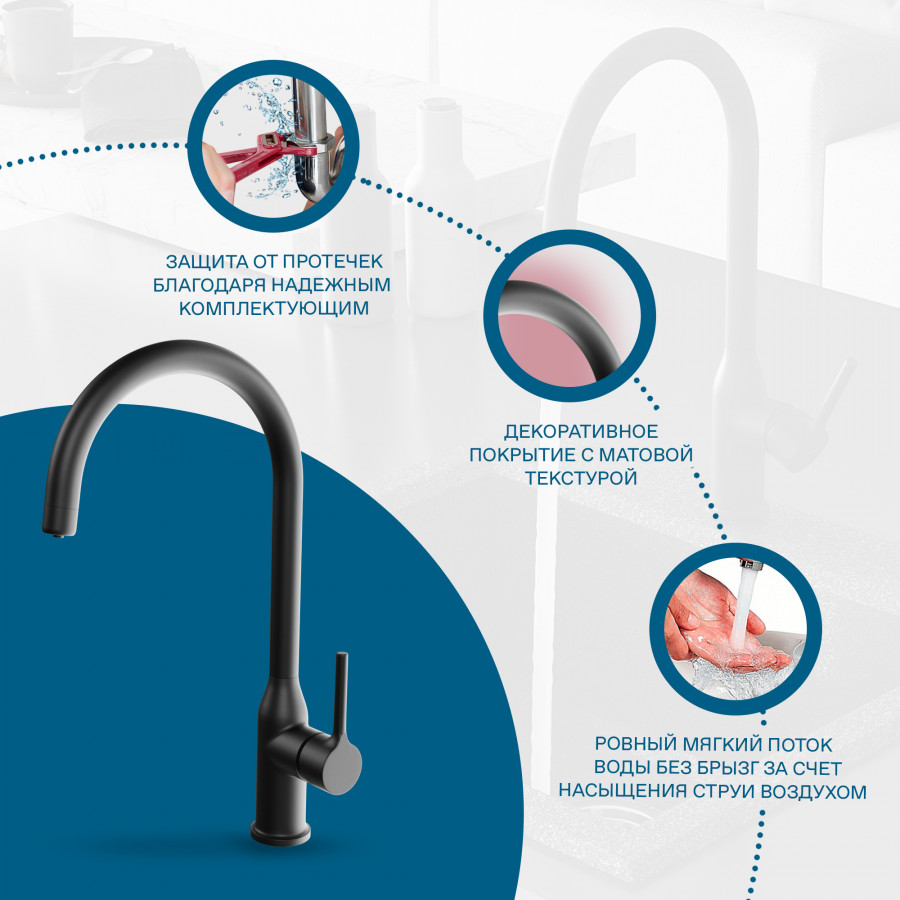 Santek Себа Смеситель однорычажный для кухни, с подключенем к фильтру питьевой воды, черный матовый, - установка на одно отверстие, - поворотный излив, - выделенный канал в смесителе для питьевой воды, - управление фильтрованной и водопроводной водой осуществяется с помощью одной ручки: для открытия крана фильтрованной воды достаточно просто наклонить ручку на себя на 90 градусов в закрытом состоянии, управление водопроводной водой производится привычным способом, - ровный и мягкий поток без брызг за счет насыщения струи воды воздухом, - Гибкая подводка G1/2" x M10, - сверхпрочные шланги гибкой подводки, изготовленные по технологии сшитого полиэтилена (PEX) с увеличенным сроком службы до 50 лет, в оплетке из нержавеющей стали AISI 304, - переходник для подключения к фильтру в комплекте, - керамический картридж D35 мм, плавный ход рычага смесителя, контроль и точность при выборе напора и температуры воды, - долгий срок службы, герметичность и безопасность для здоровья за счет использования высококачественных материалов и надежных компонентов, - черная поверхность с матовым эффектом.