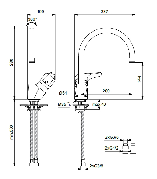 - Съемные шланги для подвода воды длиной 55 см, G 3/8 (с переходником G 1/2).