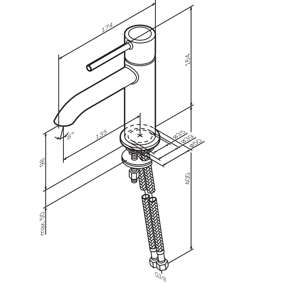 Комплектация: смеситель, комплект крепежа, гибкая подводка, инструкция.