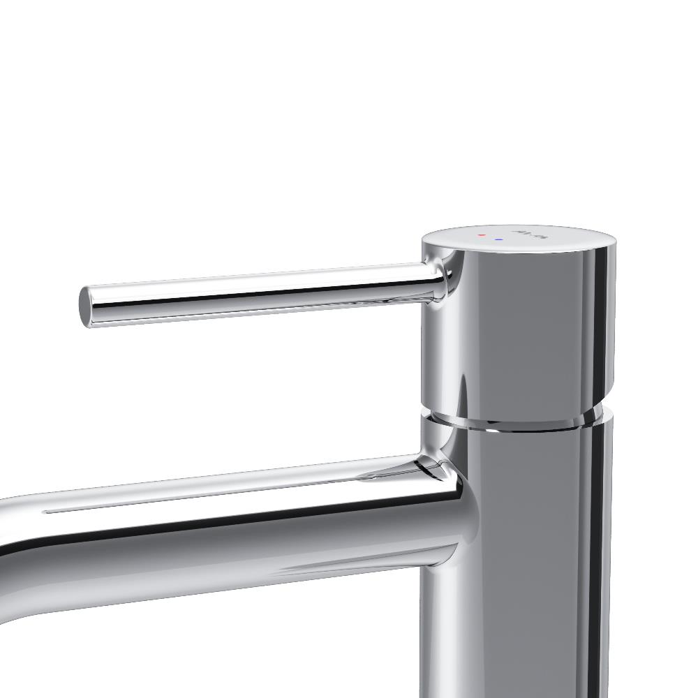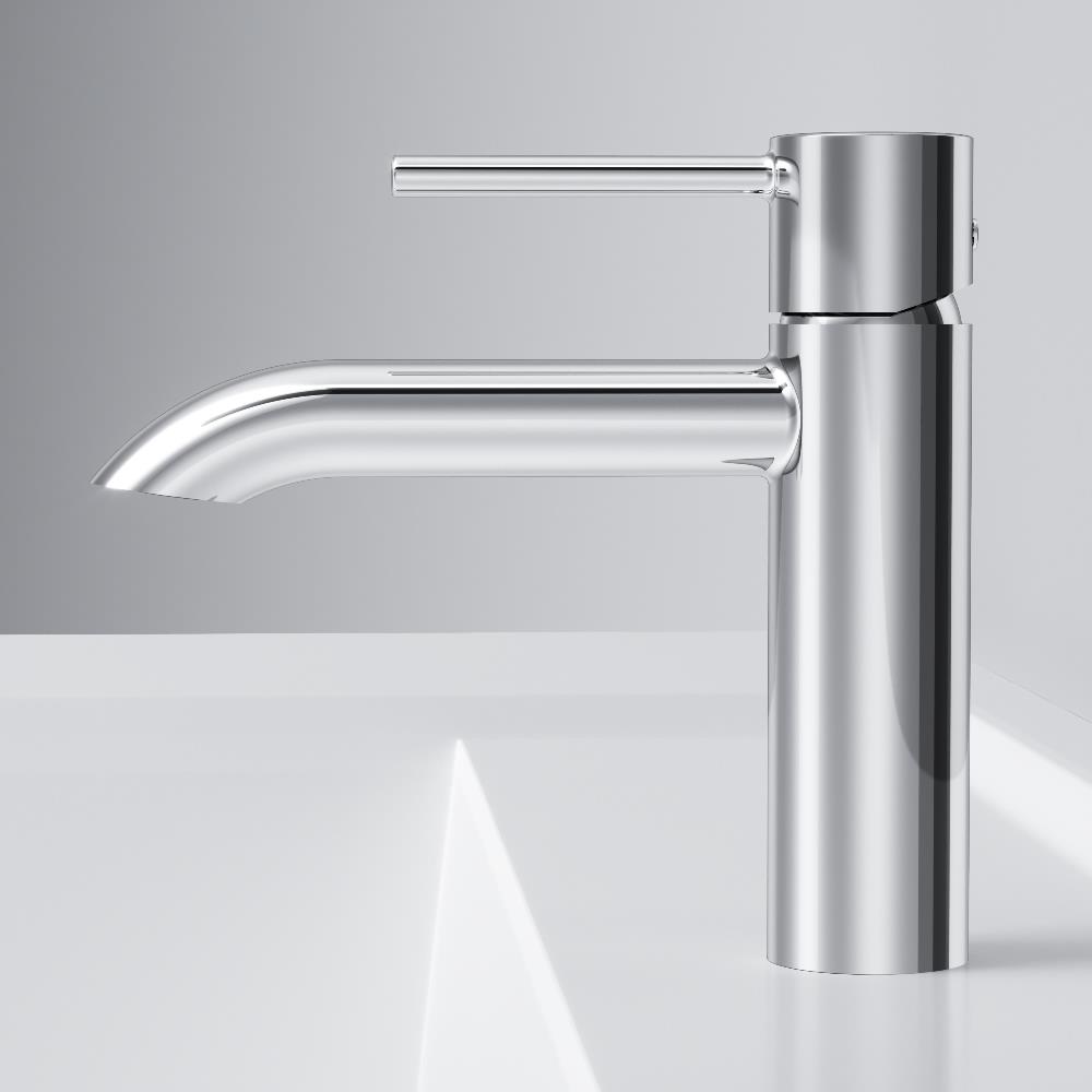 Характерный излив — ключевая особенность коллекции. Выверенный изгиб в сочетании с чистой горизонталью излива подчёркивает архитектурную чистоту формы. Такое решение требует высокой точности производства и формирует цельный визуально безупречный силуэт.