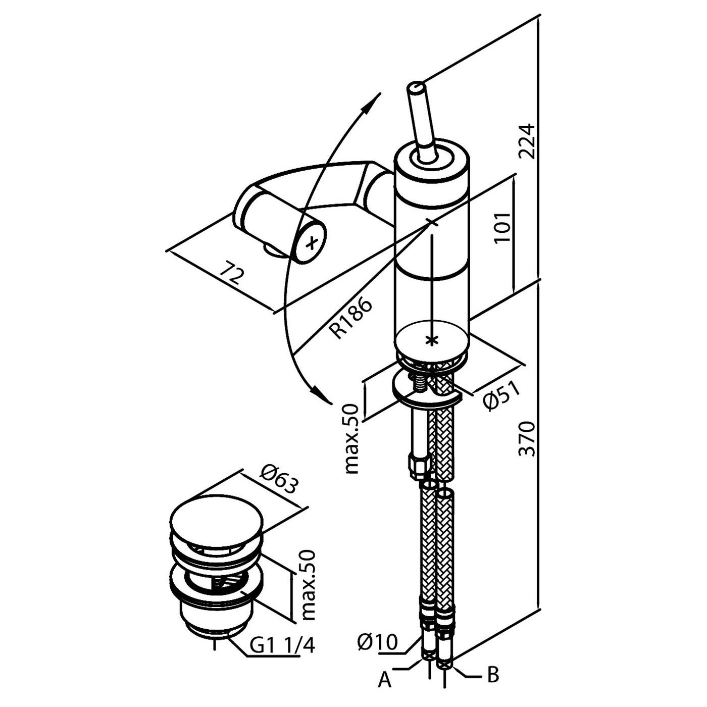 Поворотный излив имеет радиус 360 градусов в горизонтальной и 180 градусов в вертикальной плоскости.