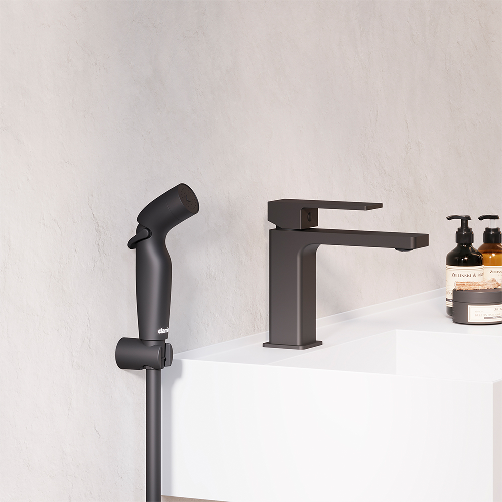 Долгожданное пополнение коллекции Gala – смеситель для раковины с гигиеническим душем в матовом черном цвете. Самое современное и эстетичное решение для совмещенного санузла. Смеситель обладает мягкими геометричными формами и будет прекрасно сочетаться с другими продуктами из коллекции.