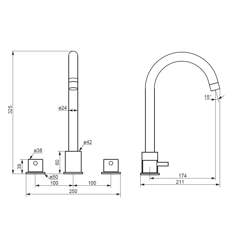 Смеситель для раковины состоит из трех секций: температура воды регулируется отдельными ручками независимо друг от друга как на ретро смесителях. Ручки в виде стика станут ярким акцентом и привнесут особую эстетику в интерьер ванной комнаты.