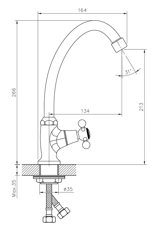 Кран для холодный воды, высота излива 21 см, длина 13 см, хром