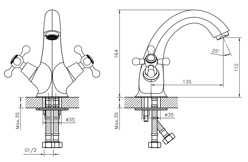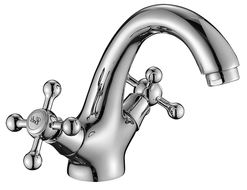 Смеситель для раковины монолитный, вентильный, высота излива 11 см, длина 13,5 см, хром