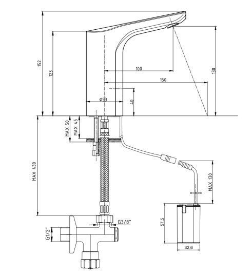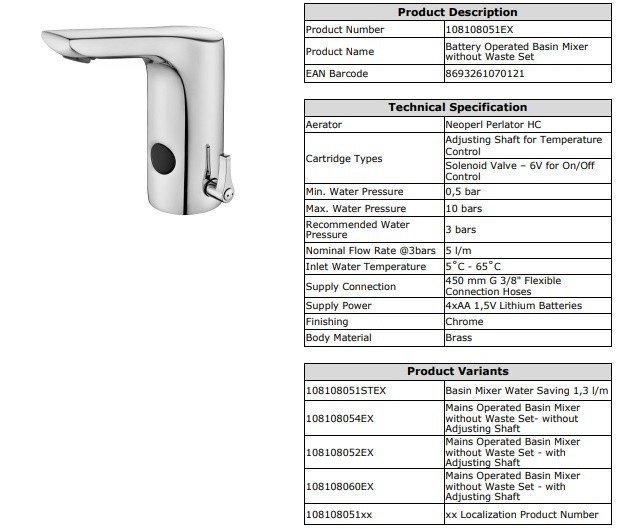 Электронный смеситель для раковины (хром). Со смешиванием, регулировка температуры на корпусе. Двойной вход воды. Работает от батареи 6 В. В комплект поставки входят угловые краны с фильтром. Аэратор с защитой против накипи. Расход воды под давлением 3 бара составляет 5 л/мин.