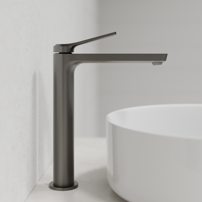 Смеситель для накладного умывальника, Латунь ЛЦ40C (ГОСТ 17711-93), Матовый графит, PVD покрытие, Однозахватный, Монтаж - На столешницу, Подключение - Гибкая подводка из нетоксичной EPDM резины в оплетке из нержавеющей стали, М10 - 1/2, длина 450 мм