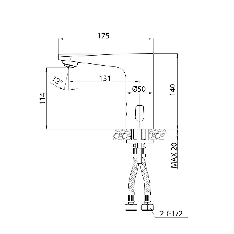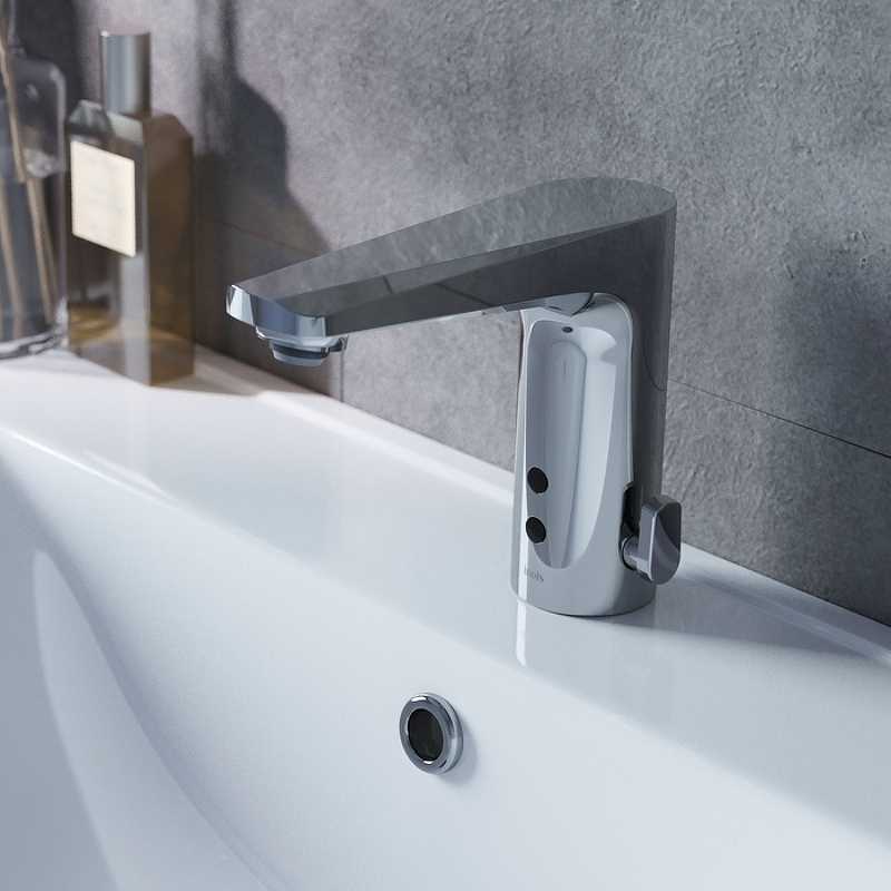Смеситель для умывальника, латунь, хром, сенсорное управление, силиконовый аэратор Neoperl. Регулировка температуры на корпусе смесителя. Работает от сети и от батареек. Время работы 1 минута. В комлекте: гибкая подводка, соединительный провод, крепёж.