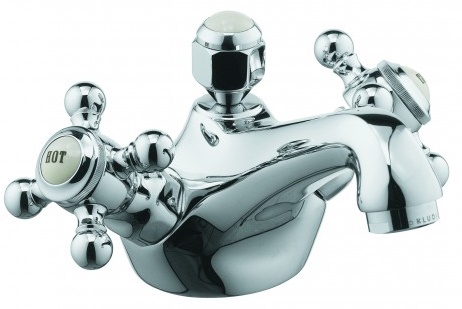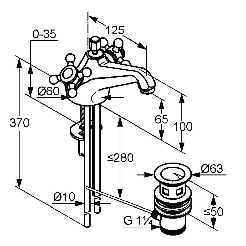 Смеситель на умывальник DN 8: крестообразные рукоятки, монтаж на одно отверстие, класс расхода воды А, каскадный аэратор М 24 х 1, керамическая кран-букса 180°, донный клапан G 1 1/4, медные трубки 10 мм.