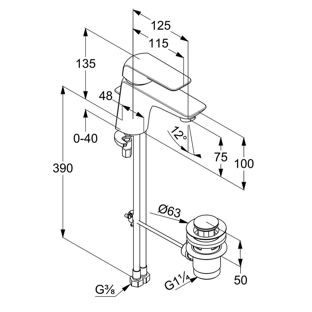 Однорычажный смеситель на умывальник DN 15: литой рычаг, монтаж на одно отверстие, расход воды 6 л/мин, аэратор s-pointer Eco PCA M 24 x 1, керамический картридж с ограничителем горячей воды.