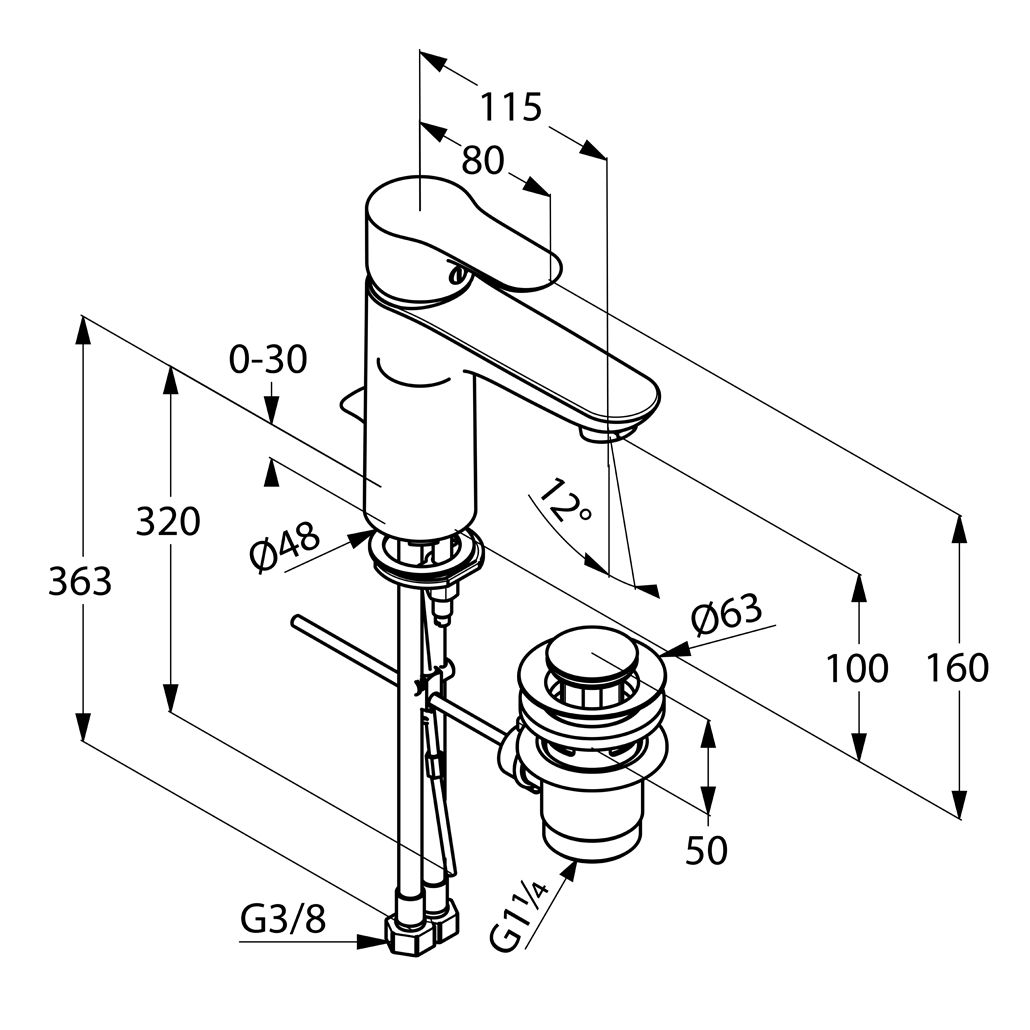 Однорычажный смеситель на умывальник XL DN 10: литой рычаг, монтаж на одно отверстие, керамический картридж с ограничителем горячей воды, аэратор s-pointer Eco M 24 x 1, класс расхода воды Z, гибкая подводка G 3/8, система быстрого монтажа, донный клапан G 1 1/4.