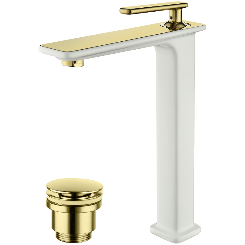 Смеситель для раковины, высокий, монолитный, высота излива 24,5 см, длина 16 см, с донным клапаном, белый/золото