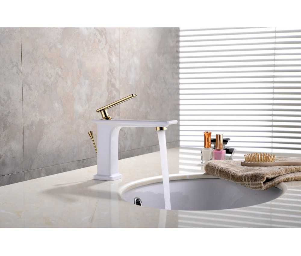 - Смеситель для раковины Lemark Mista LM6406WG в сочетании белого и золотого цветов – выбор для роскошных интерьеров.