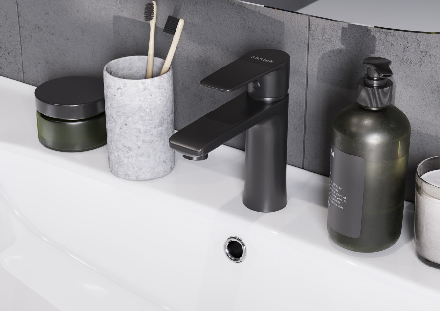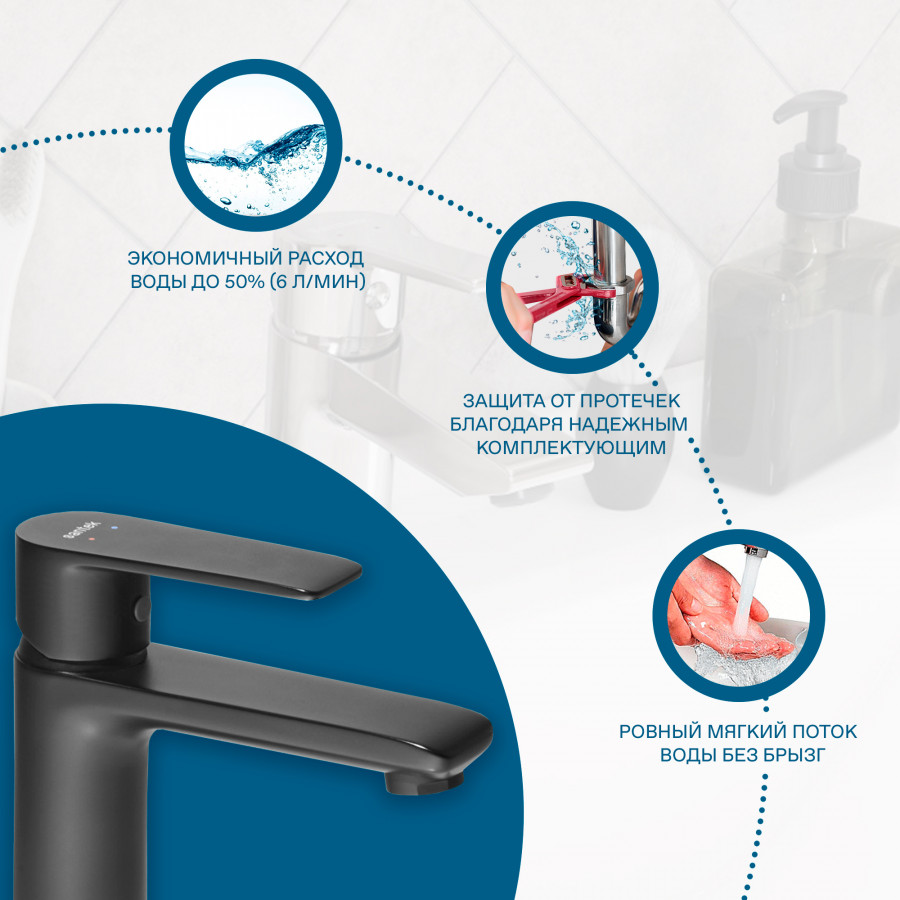 Santek Арма Смеситель однорычажный для раковины, черный матовый, - установка на одно отверстие, - экономичный расход воды 6 литров/мин (при давлении 3 бар), - ровный и мягкий поток без брызг за счет насыщения струи воды воздухом, - Гибкая подводка G1/2", - сверхпрочные шланги гибкой подводки, изготовленные по технологии сшитого полиэтилена (PEX) и сроком службы до 50 лет, в оплетке из нержавеющей стали AISI 304. - керамический картридж D35 мм, плавный ход рычага смесителя, контроль и точность при выборе напора и температуры воды, - долгий срок службы, герметичность и безопасность для здоровья за счет использования высококачественных материалов и надежных компонентов, - черная поверхность с приятным матовым эффектом.