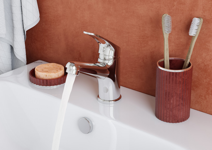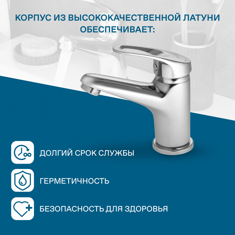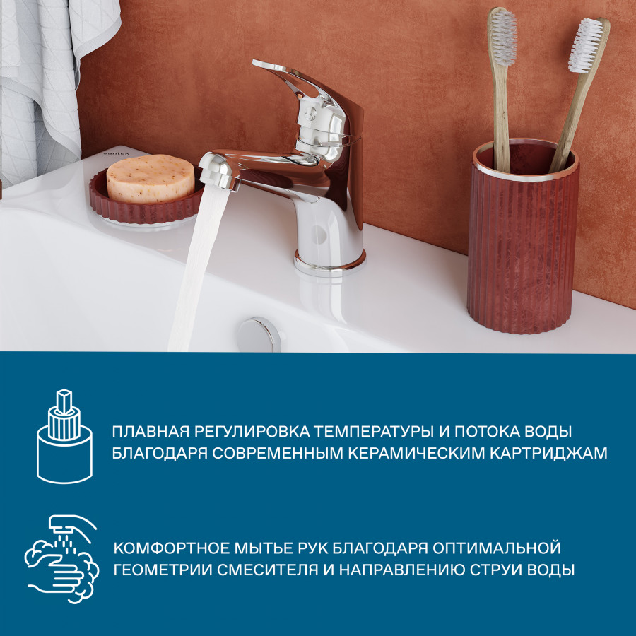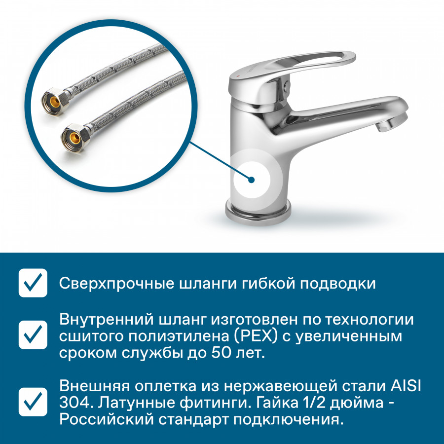 Santek Баус Смеситель однорычажный для раковины, хром, - установка на одно отверстие, - экономичный расход воды 6 литров/мин (при давлении 3 бар), - ровный и мягкий поток без брызг за счет насыщения струи воды воздухом, - Гибкая подводка G1/2" x M10, - сверхпрочные шланги гибкой подводки, изготовленные по технологии сшитого полиэтилена (PEX) с увеличенным сроком службы до 50 лет, в оплетке из нержавеющей стали AISI 304, - керамический картридж D35 мм, плавный ход рычага смесителя, контроль и точность при выборе напора и температуры воды, - долгий срок службы, герметичность и безопасность для здоровья за счет использования высококачественных материалов и надежных компонентов, - хромированная поверхность, зеркальный блеск и защита от коррозии на долгий срок.