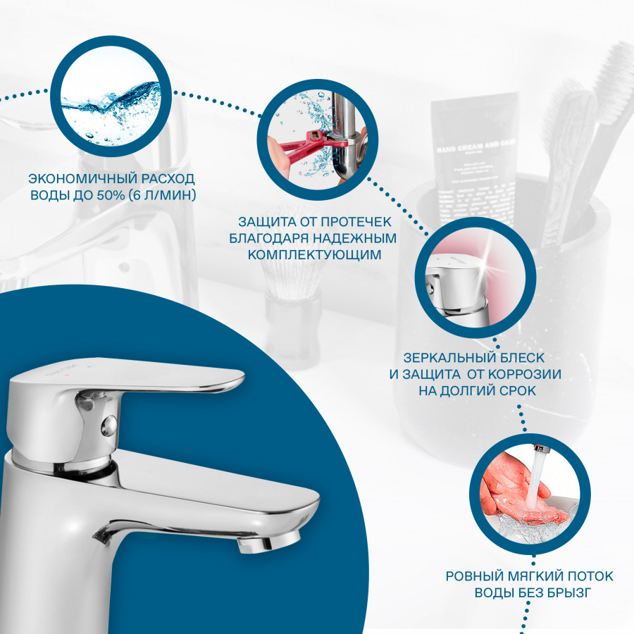 Santek Форт Смеситель однорычажный для раковины, хром, - установка на одно отверстие, - экономичный расход воды 6 литров/мин (при давлении 3 бар), - ровный и мягкий поток без брызг за счет насыщения струи воды воздухом, - Гибкая подводка G1/2", - сверхпрочные шланги гибкой подводки, изготовленные по технологии сшитого полиэтилена (PEX) и сроком службы до 50 лет, в оплетке из нержавеющей стали AISI 304. - керамический картридж D35 мм, плавный ход рычага смесителя, контроль и точность при выборе напора и температуры воды, - долгий срок службы, герметичность и безопасность для здоровья за счет использования высококачественных материалов и надежных компонентов, - хромированная поверхность, зеркальный блеск и защита от коррозии на долгий срок.