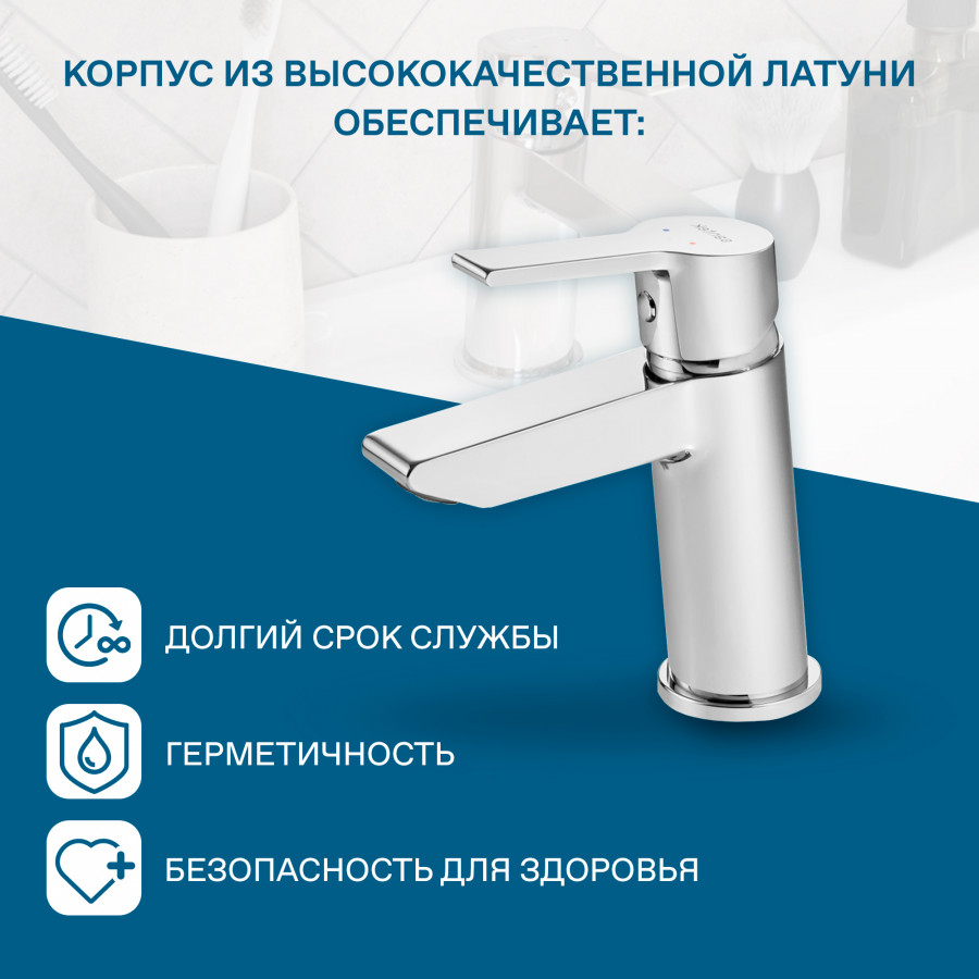Santek Найра Смеситель однорычажный для раковины, хром, - установка на одно отверстие, - экономичный расход воды 6 литров/мин (при давлении 3 бар), - ровный и мягкий поток без брызг за счет насыщения струи воды воздухом, - Гибкая подводка G1/2", - сверхпрочные шланги гибкой подводки, изготовленные по технологии сшитого полиэтилена (PEX) и сроком службы до 50 лет, в оплетке из нержавеющей стали AISI 304. - керамический картридж D35 мм, плавный ход рычага смесителя, контроль и точность при выборе напора и температуры воды, - долгий срок службы, герметичность и безопасность для здоровья за счет использования высококачественных материалов и надежных компонентов, - хромированная поверхность, зеркальный блеск и защита от коррозии на долгий срок.
