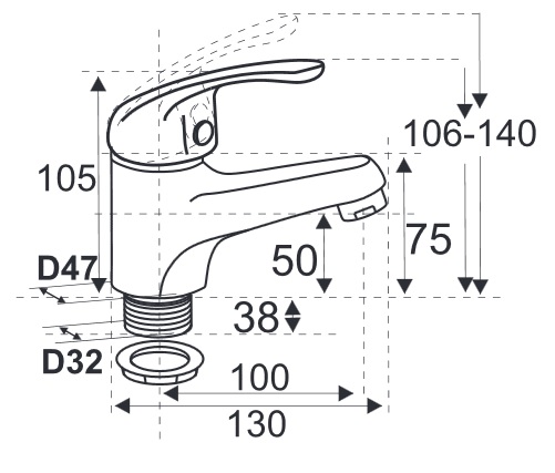 Смешивание и подача воды происходит с помощью керамического картриджа диаметром 40 мм и монолитным изливом длиной 100 мм. Смеситель крепится на умывальнике с помощью шпильки. Без гибкой подводки в комплекте.