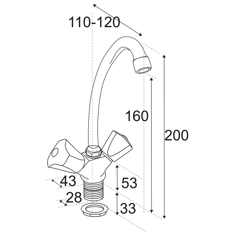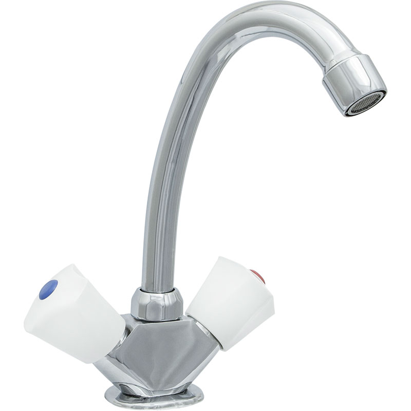 Смешивание и подача воды происходит с помощью двух пластиковых хромированных маховиков Мария с керамическими кран-буксами и поворотным изливом высотой 180 мм, длина излива 160 мм. Смеситель крепится на мойке с помощью гайки, в комплекте гибкая подводка подключения воды 1/2"".