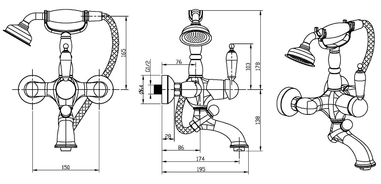 Смеситель для ванны и душа Boheme Brillante Ripresa с душевым гарнитуром хром (343)