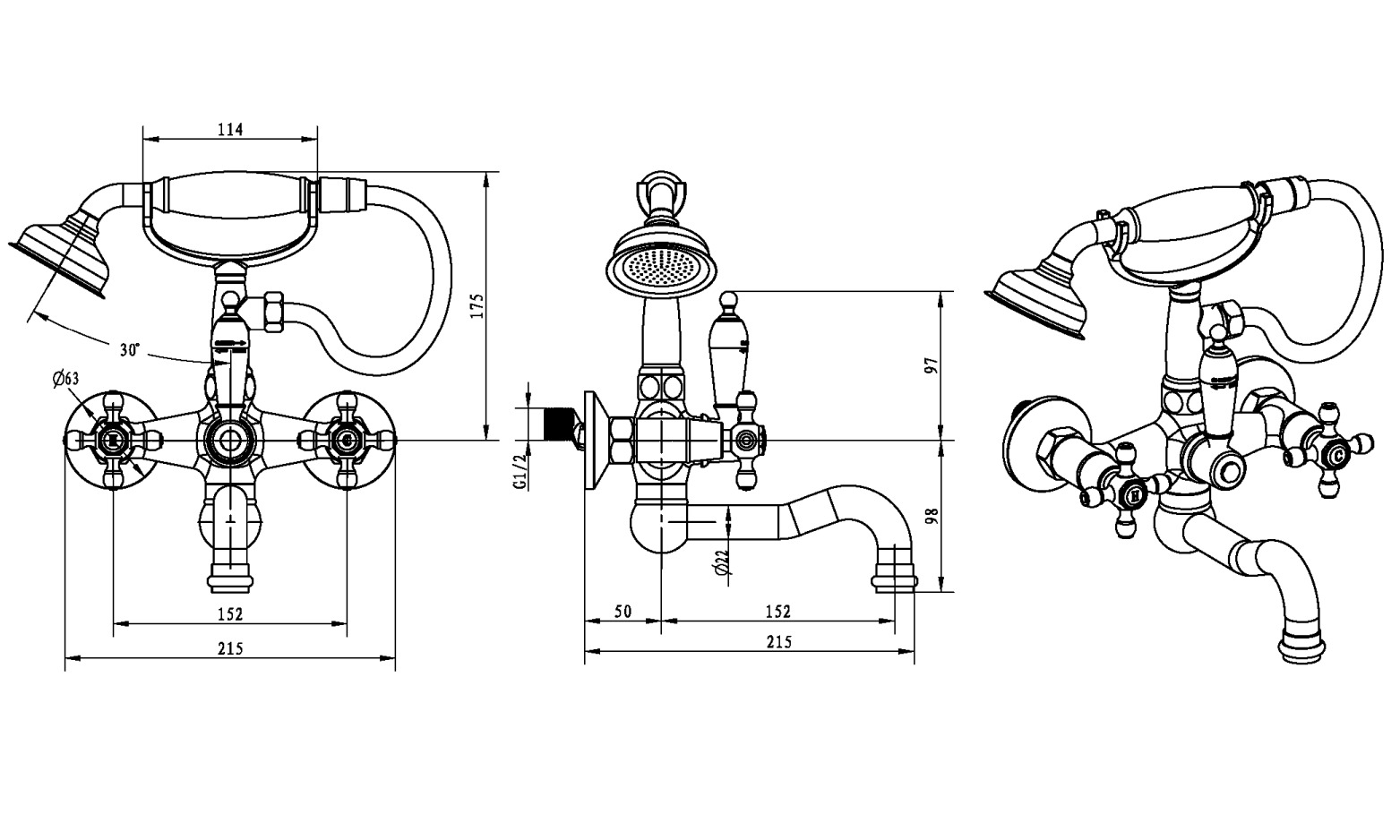Комплектация: смеситель, лейка ручная, шланг душевой