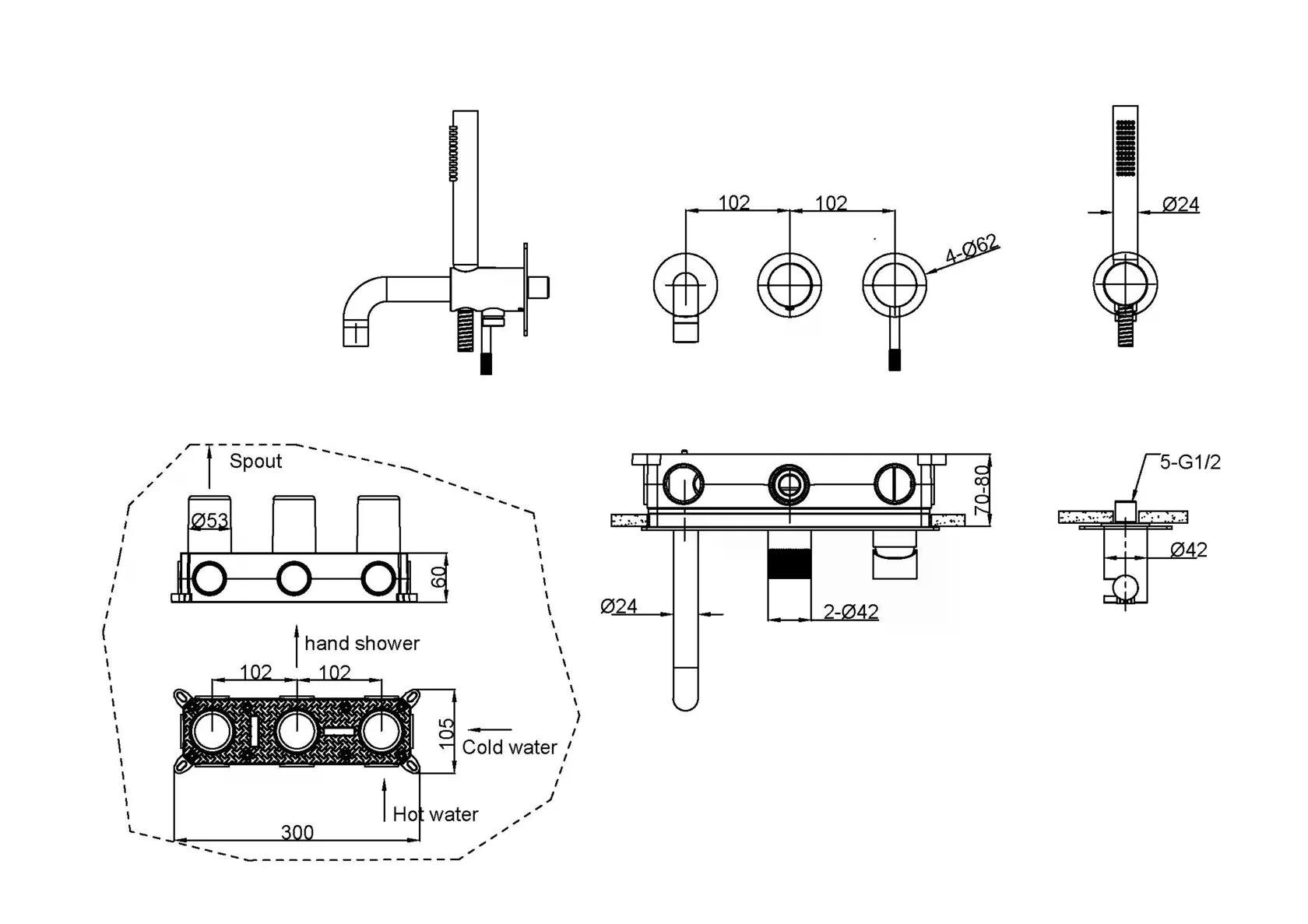 Состав поставки: смеситель (внешняя и внутренняя часть), излив, душевой шланг, душевая лейка