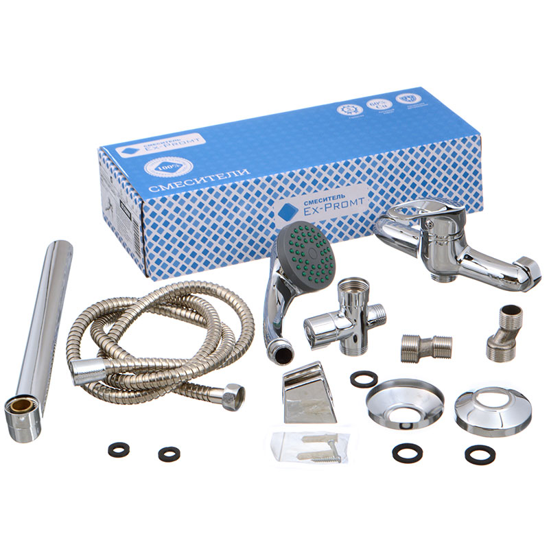 Состав поставки: держатель лейки, душевая лейка, душевой шланг, комплект отражателей, комплект эксцентриков, смеситель