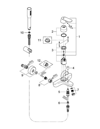 Состав поставки: смеситель, душевой шланг 1500, душевая лейка, держатель для душа