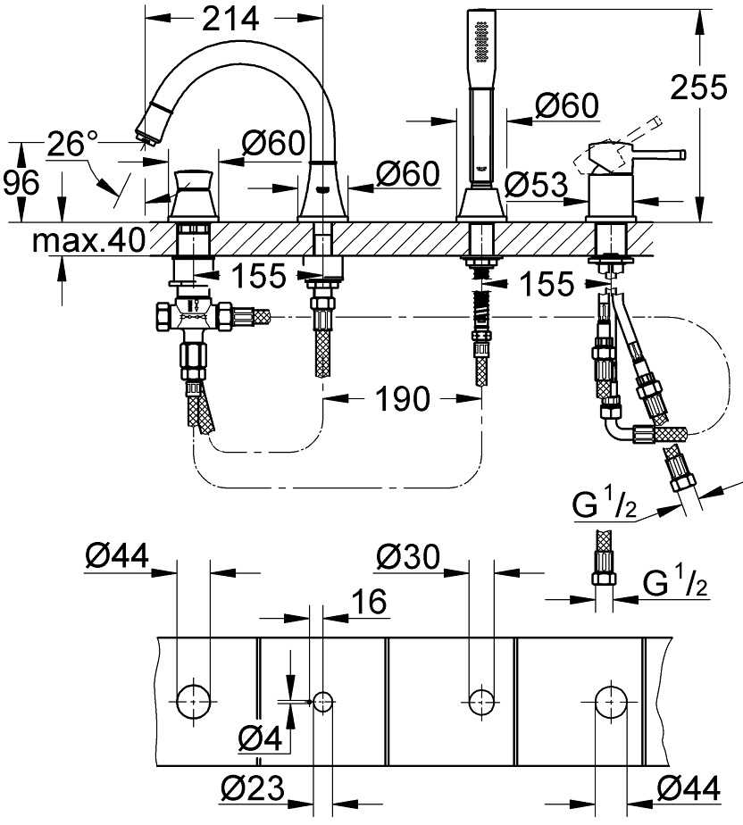 GROHE SilkMove керамический картридж 46 мм, фиксатор для излива (смонтированный), элемент управления однорычажного cмесителя, излив для ванны с аэратором и переключателем ванна/душ, Grandera ручной душ 7,6 л, металлический душевой шланг, подключение для душевого шланга, гибкая подводка