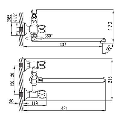 Двухзахватный смеситель, латунь, увеличенное никель-хромовое покрытие, керамические кран-буксы, керамический дивертор, излив Z06.