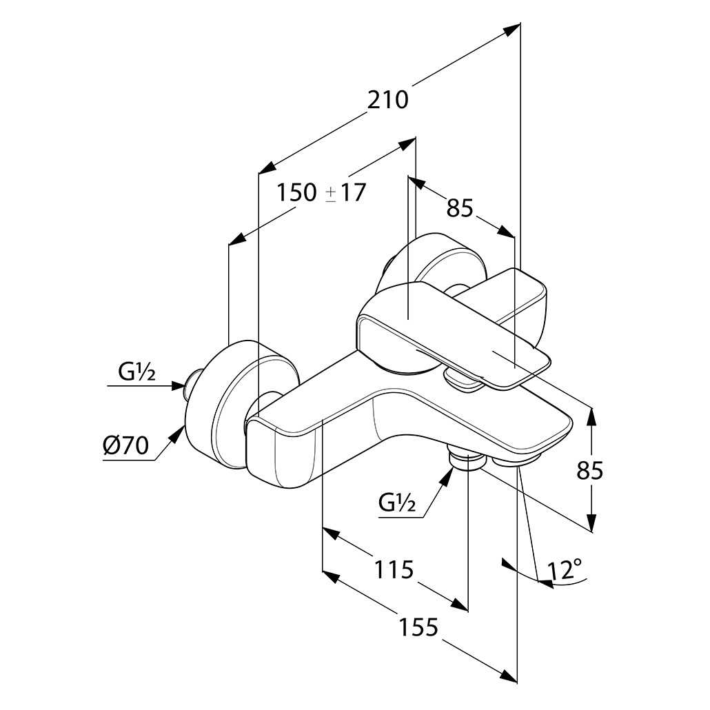Однорычажный смеситель для ванны и душа DN 15: литой рычаг, настенный монтаж, каскадный аэратор M 24 x 1, класс расхода воды DB, керамический картридж с ограничителем горячей воды.