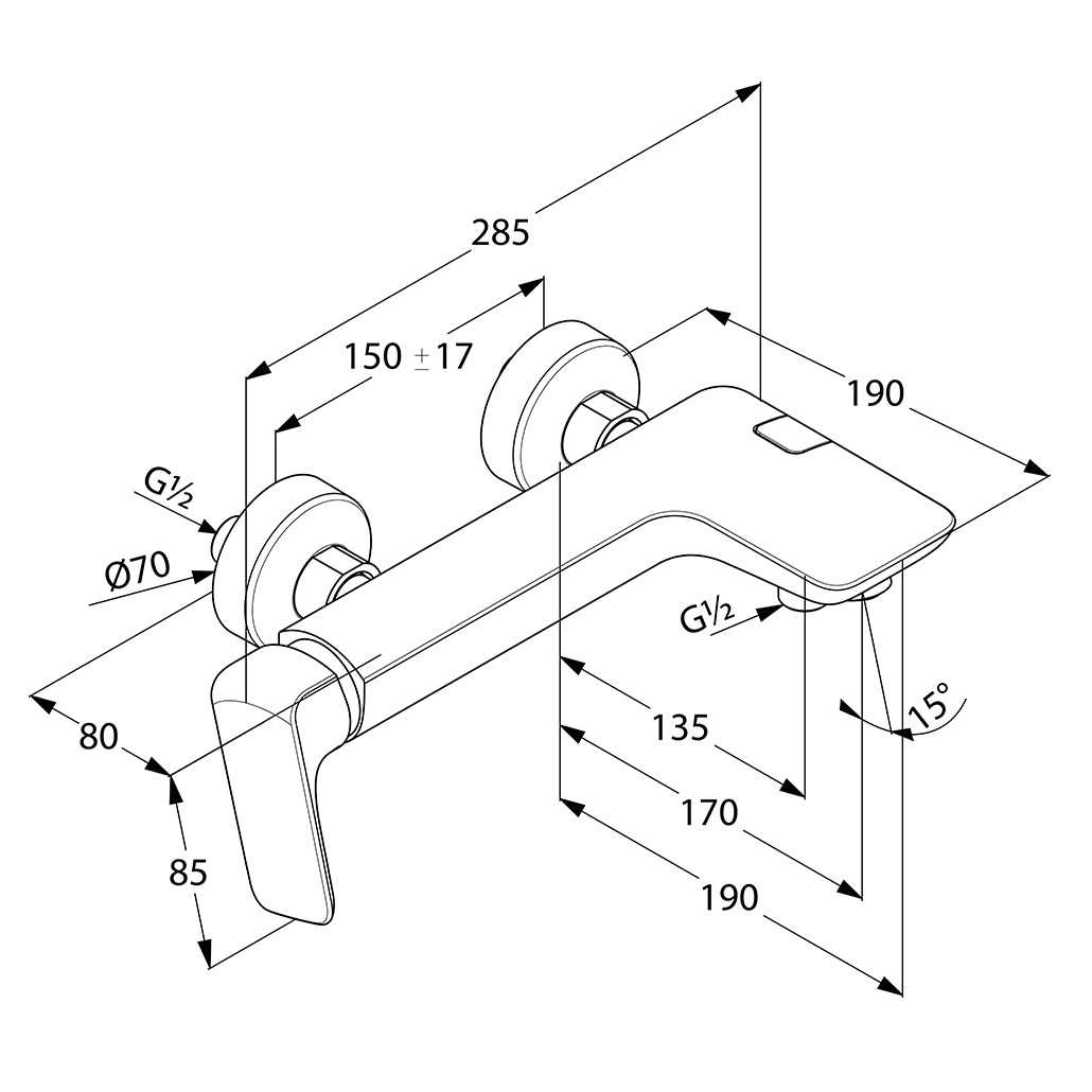 Однорычажный смеситель для ванны и душа DN 15: литой рычаг, боковое управление, настенный монтаж, каскадный аэратор M 24 x 1, класс расхода воды DB, керамический картридж с ограничителем горячей воды.